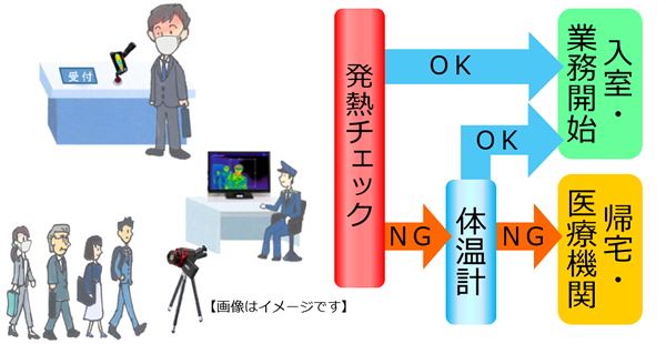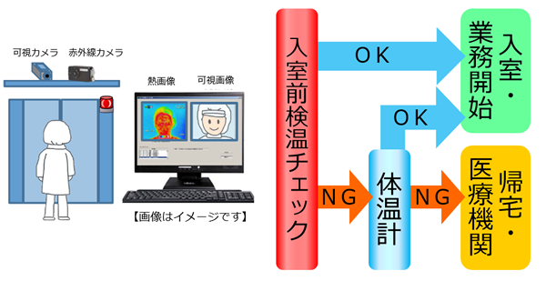 来場者(入場者)へ自身の体表温分布画像を見せる事により、発熱者の入室を留まらせ、自社の高い安全衛生意識を社外へ知らせることにも役立ちます。