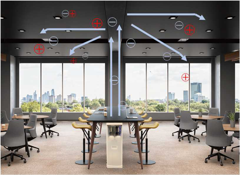 安心・安全な空間を目指して、小型イオンエンジン(特許第5819560号)を4基搭載した「サイレントナノディフューザー」が、マイナス電子を帯びさせた機能水を空気中に拡散します。