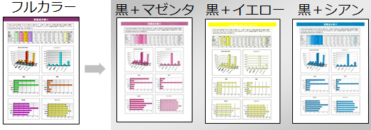 赤+黒などの指定した2色でコピー及びプリントが可能となるため、白黒料金と同料金でできるエコノミーな機能です。