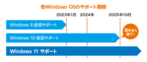 サポート終了後は、セキュリティやシステムを保護するOSのアップデートをすることができなくなります。PCが攻撃に対して脆弱になったり、パフォーマンスが落ちて生産性に影響が出ることが予想されるため、適切な時期にWindows 11を搭載したPCの購入を検討しましょう。